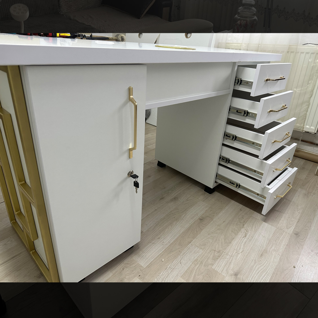 Masa dispune de 5 sertare pentru depozitare si este accesorizata cu insertii metalice aurii si riflaj alb.