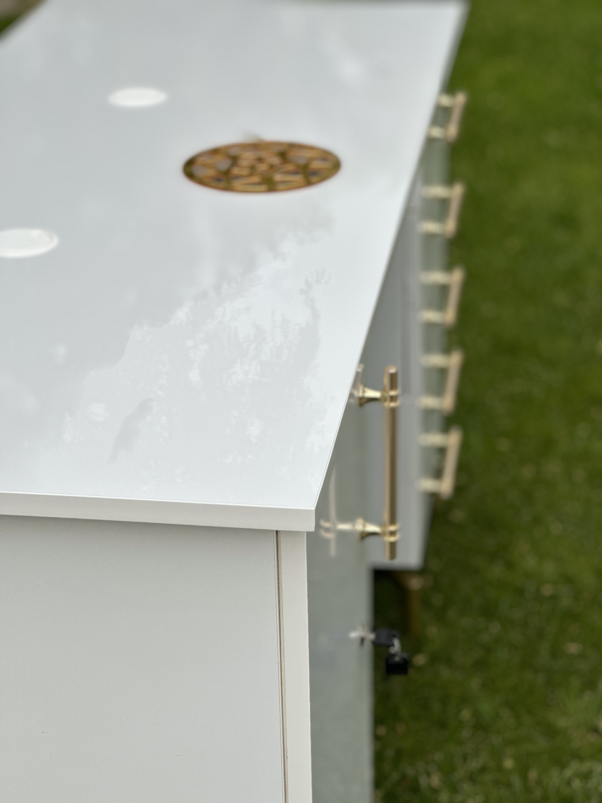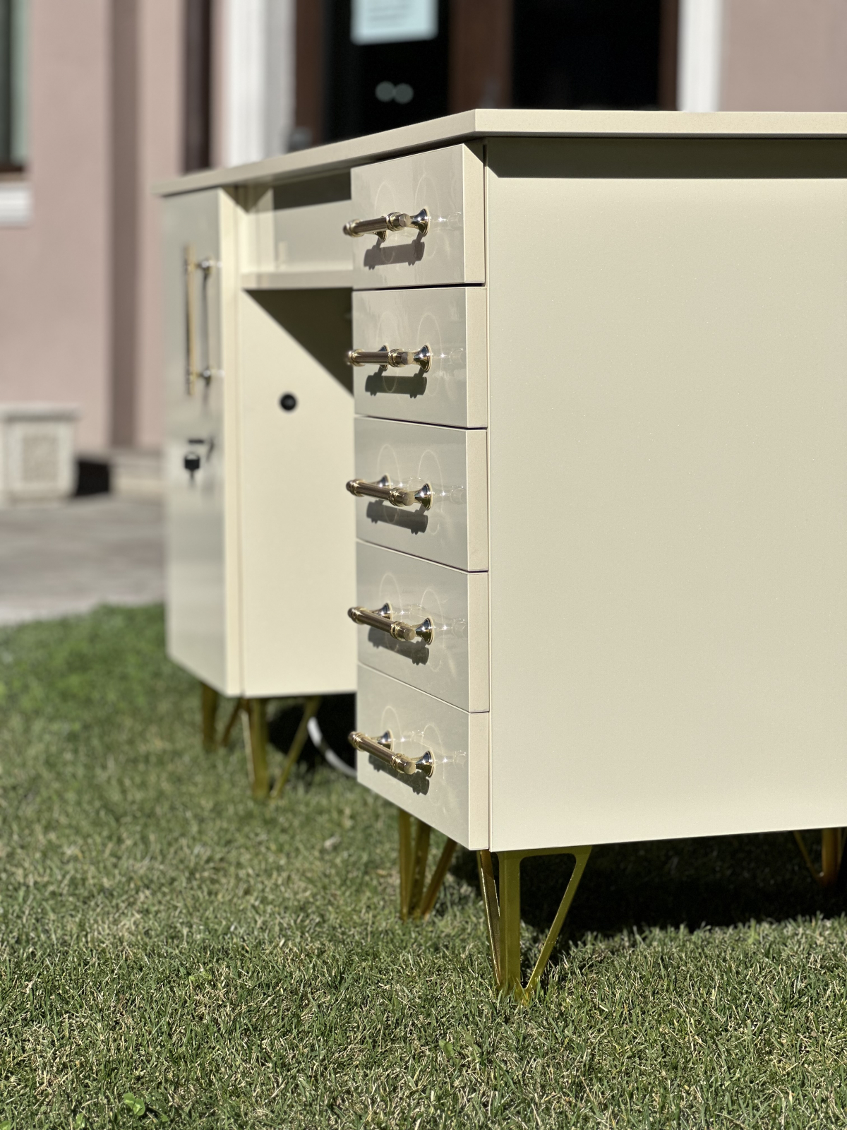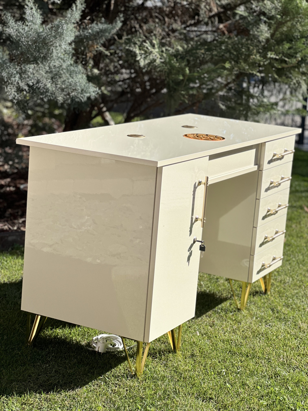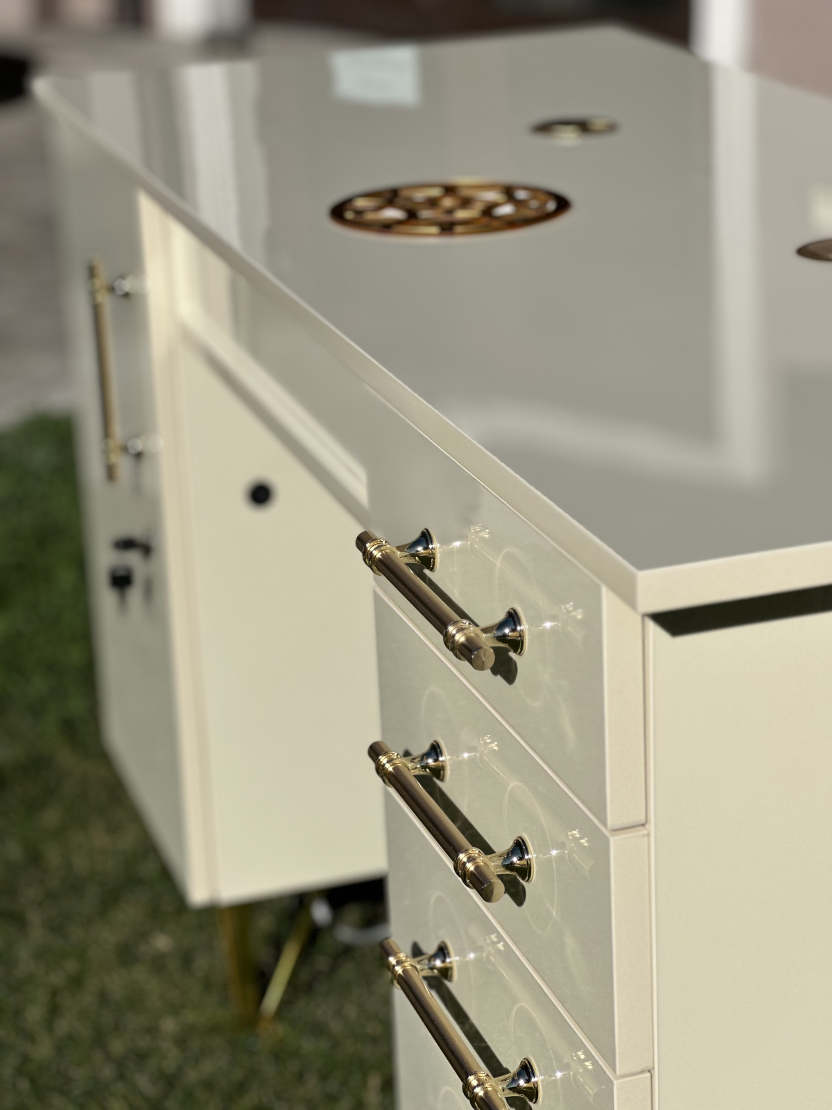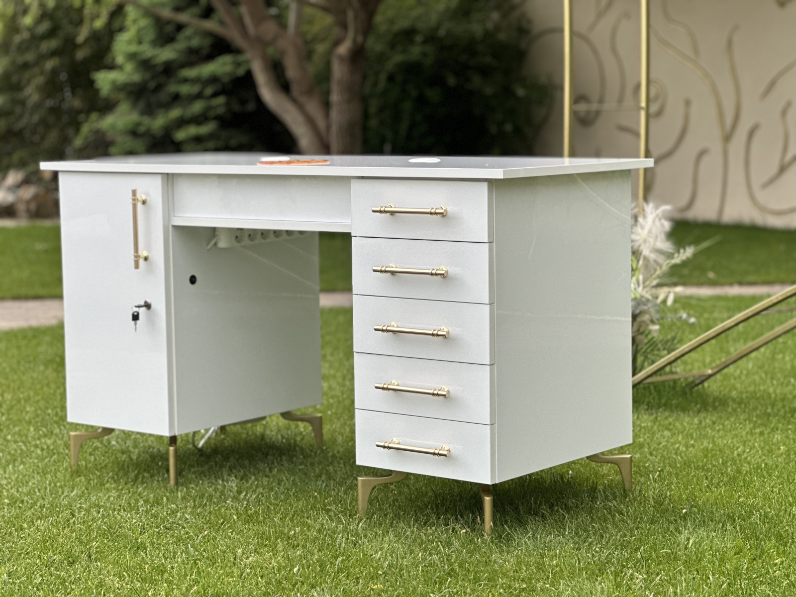Masa dispune de 5 sertare pentru depozitare si este accesorizata cu logo glass si riflaj alb.
