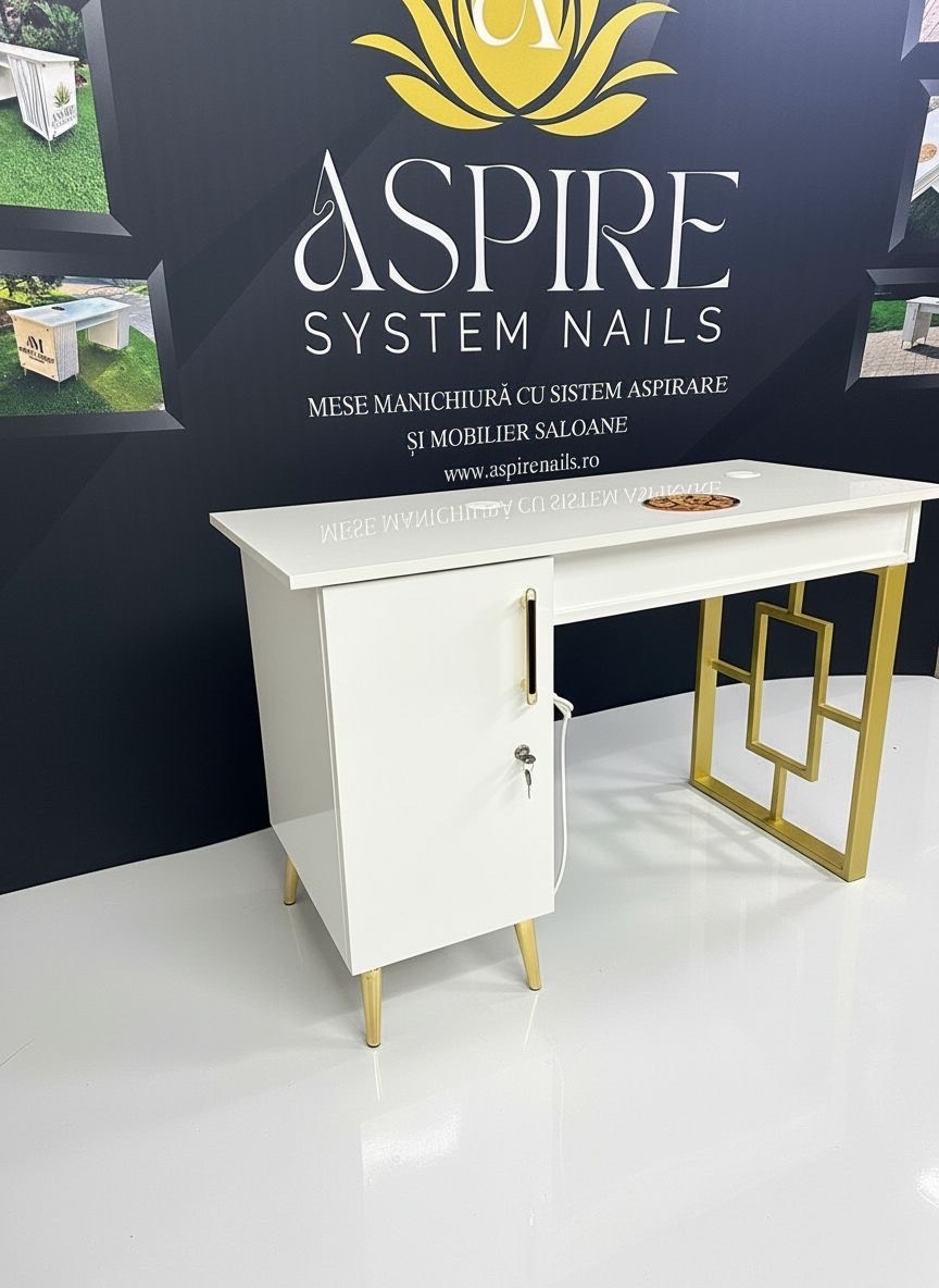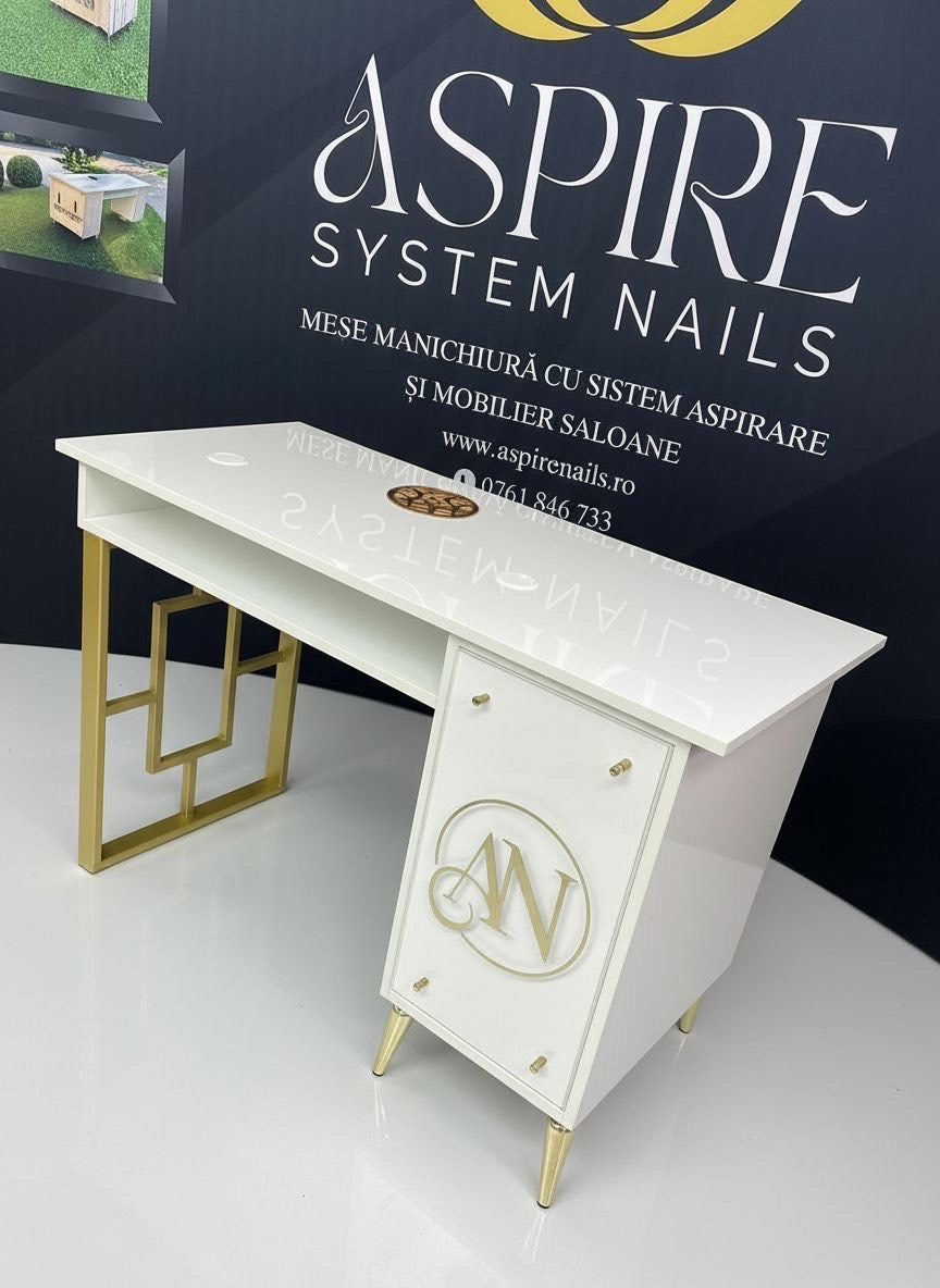 Masa este accesorizata cu logo glass si picior metalic auriu.